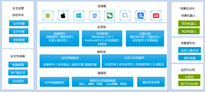⚫ 具有业务枢纽服务、会话与互动服务、会话旁路监控、双录视频回放、客户手机与坐席相互投屏、截图取证、多方 会话、视频转接、多媒体推送等功能。